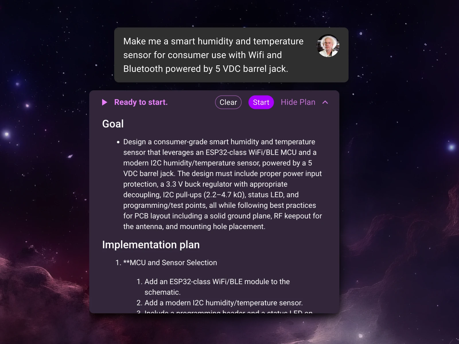 You’ll see a clear outline of the plan: parts research, schematic creation, layout, checks, and milestones for review. From there, simply tell Flux about any desired changes—add details, reorder tasks, or lock decisions—and it will refine the plan for you. It’s up to you how in the weeds you get.